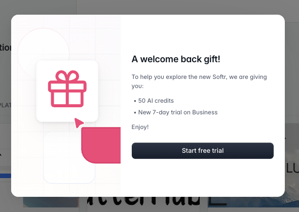 Mariam, I am hoping you can help. For two days I’ve been unable to open the Softr Studio and because of that I can’t access the studio help and help chat. With the launch of your upgrade, the Studio login has a new popup modal offering a free 7 day upgrade promotion. The trouble is that I don’t want to take up this offer just now. There is no way to opt out of the promotion or close the offer modal - so I am locked out of Softr altogether. Can you please expedite a fix with your support people?