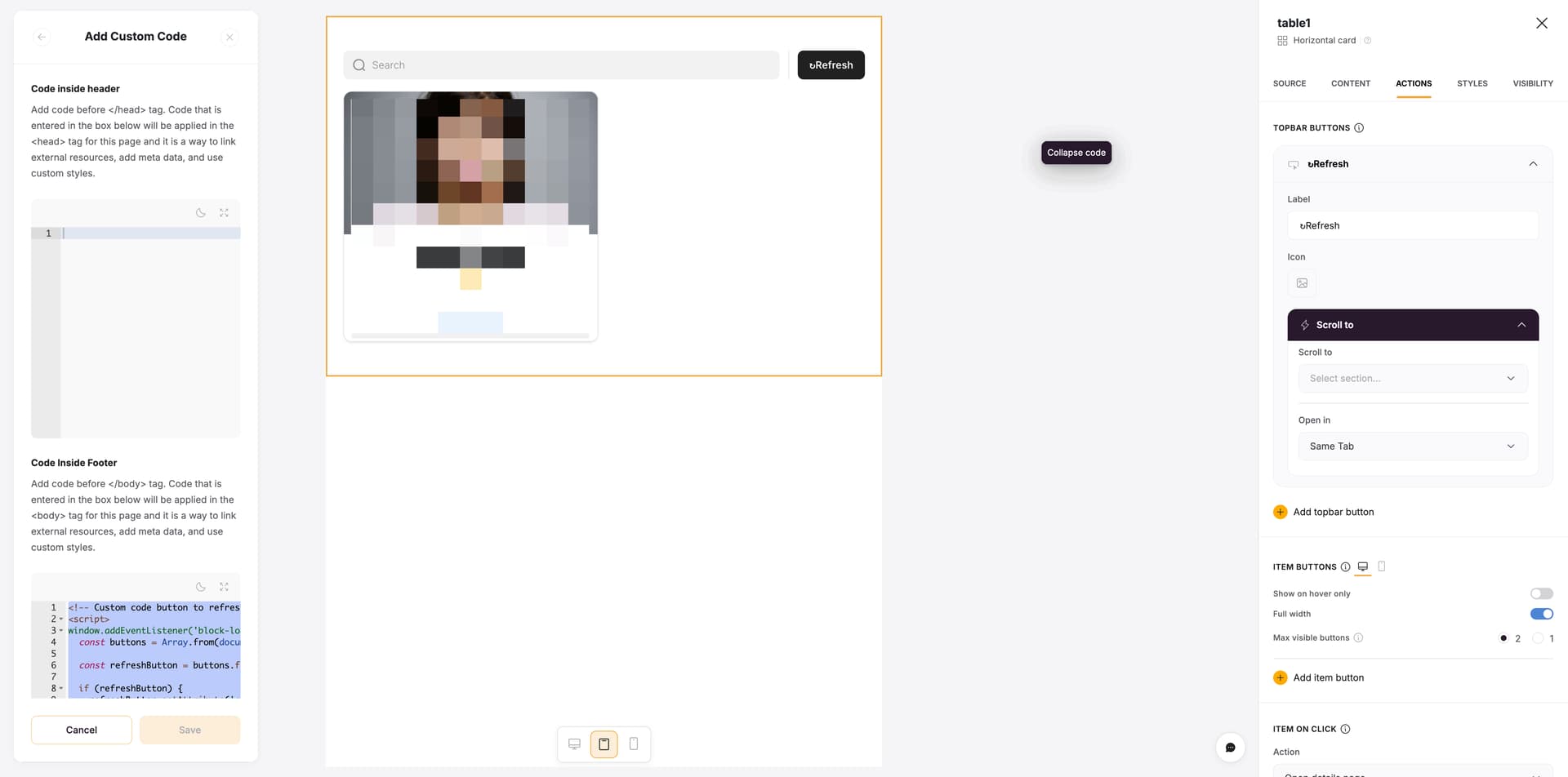 I’m looking for a way to be able to refresh a block by clicking on a button. Ideally, it would be great to utilize a top bar action button; however, a custom-code block with a button could also work.