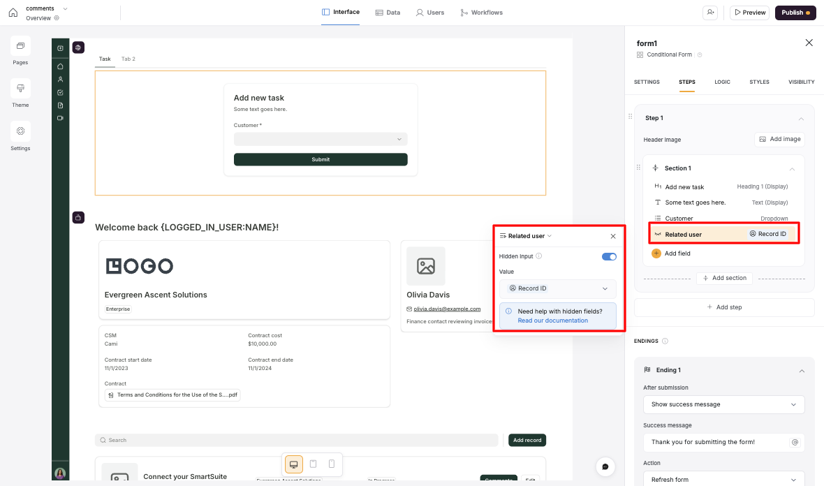 Then I have a form to create a task. I added a hidden field which is the record ID of the logged in user.