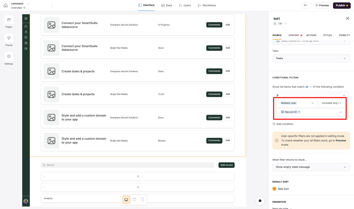 Then I added a list view of tasks. This I want to filter based on de logged in user, but when I do: