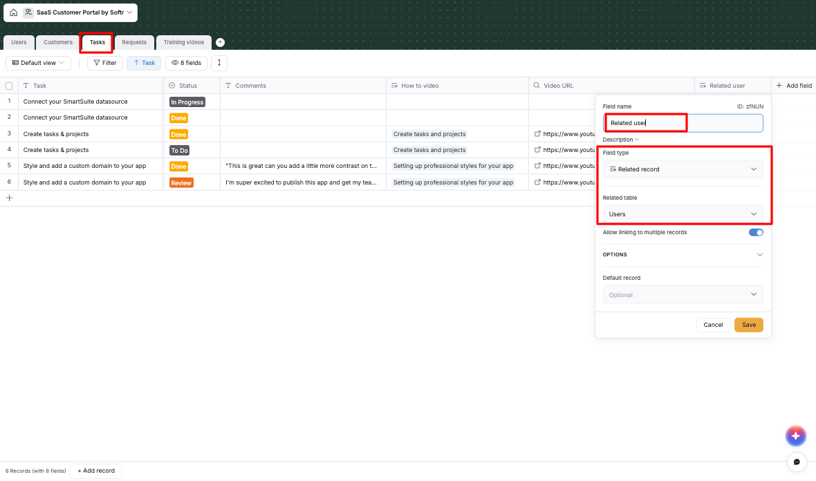 I also have a table for tasks. In that table I added a related field to the user table: REF_User