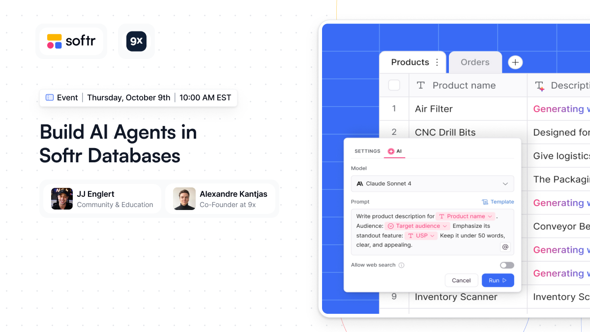 We’re going live today with our friends over at 9x (Oct 9th, at 10am EST) to show you all how to build with our new AI Agents feature in Softr Databases.