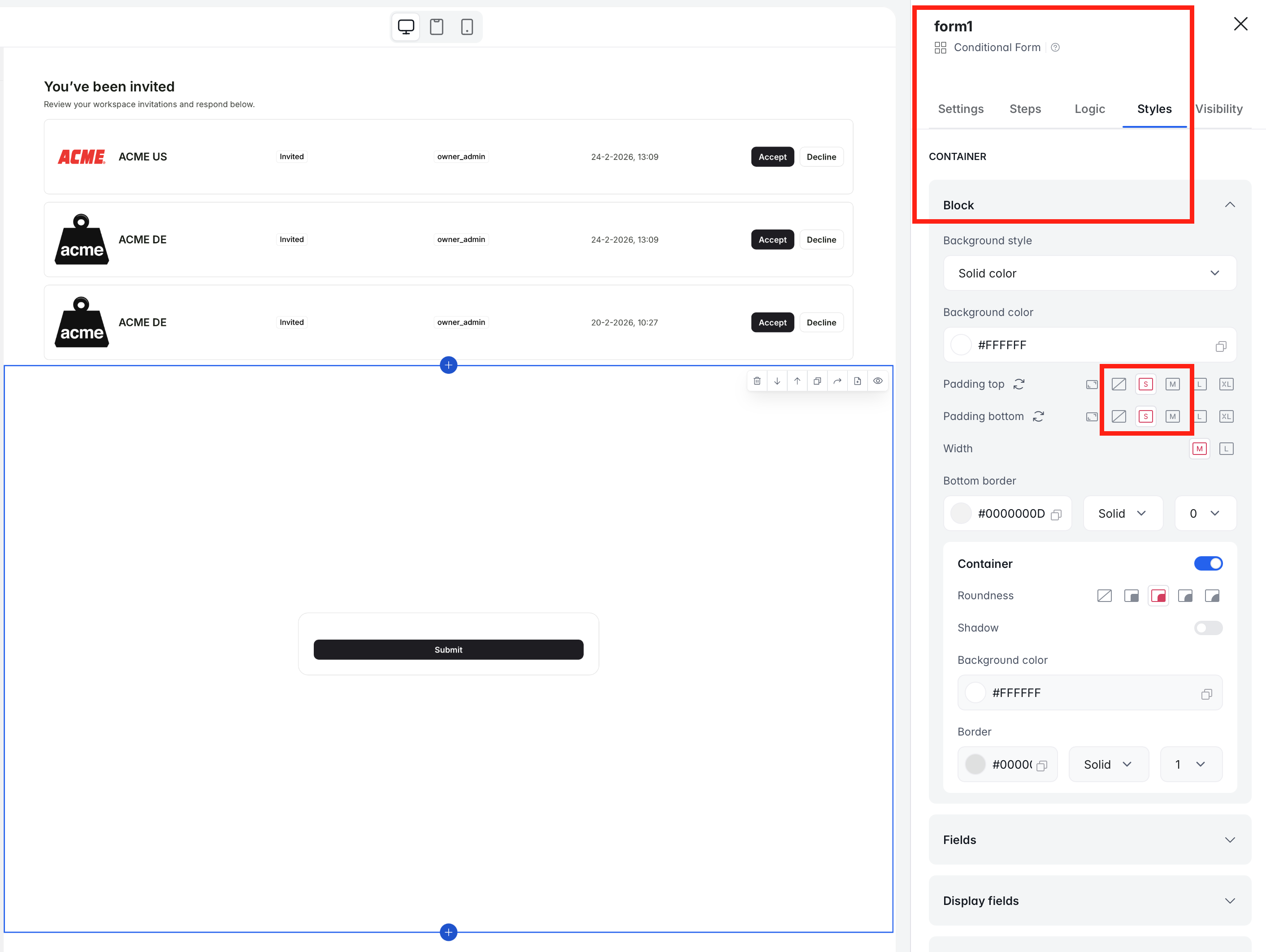 If I add a conditional form under a list, it creates a lot of extra white space (padding) - edit: when you remove all visible fields. Would it be possible to remove that? Also, could we tweak (or better - optionally remove) the toast message? I’m not using it at all because my custom workflow handles everything.