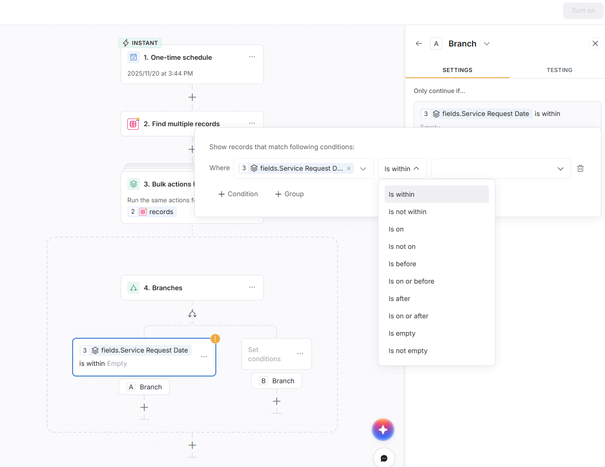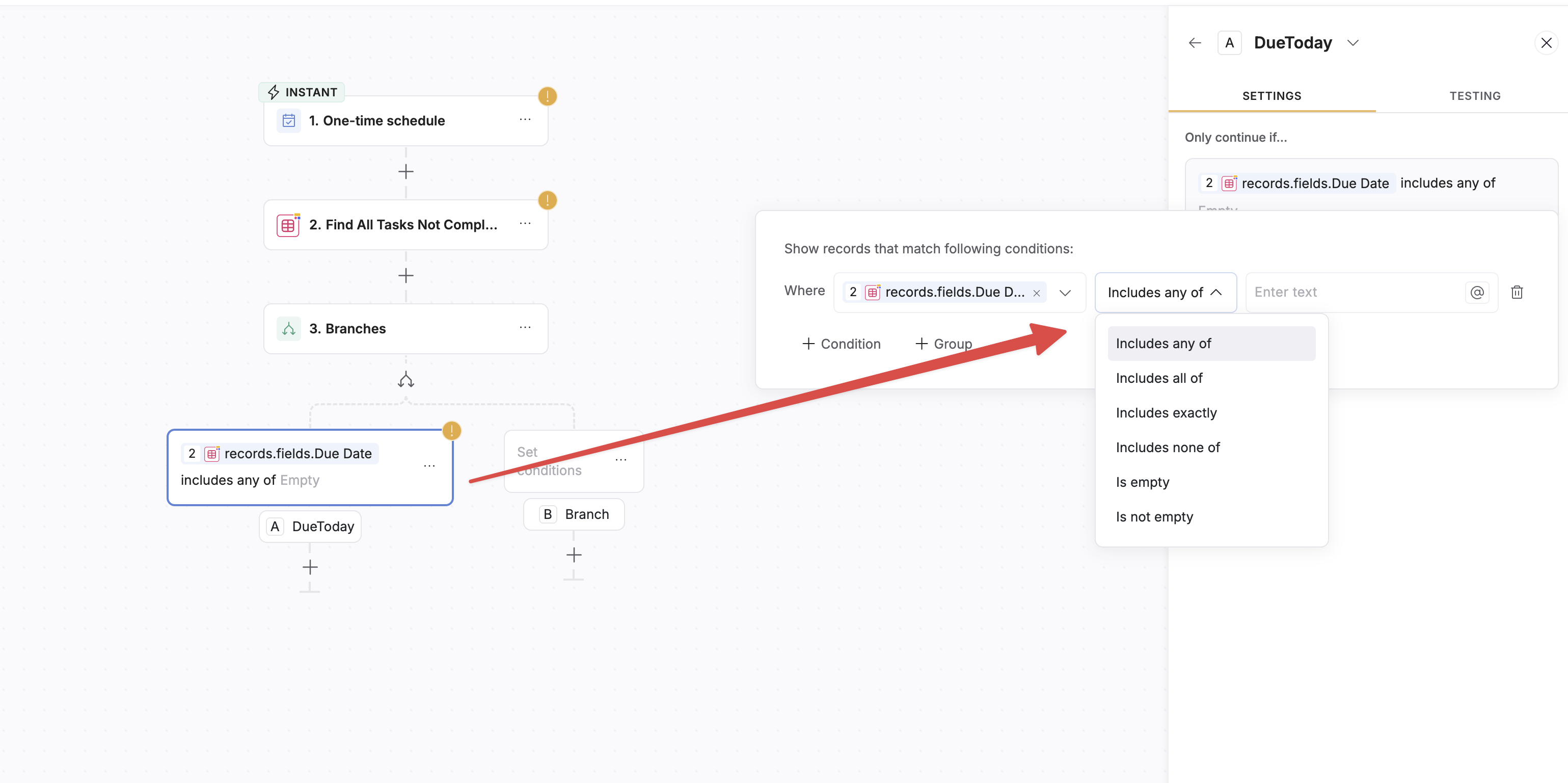 I encountered this issue with workflows as well. From my testing, the issue is not related to the position in the branch, but rather the setting on the field you are referencing in the 2nd screenshot (records.fields.due date). For linked records that link to multiple items, you get the “included any of” list, but if you point to a field that only links to 1 item, then you get a different set of filters like what you see in step 1.