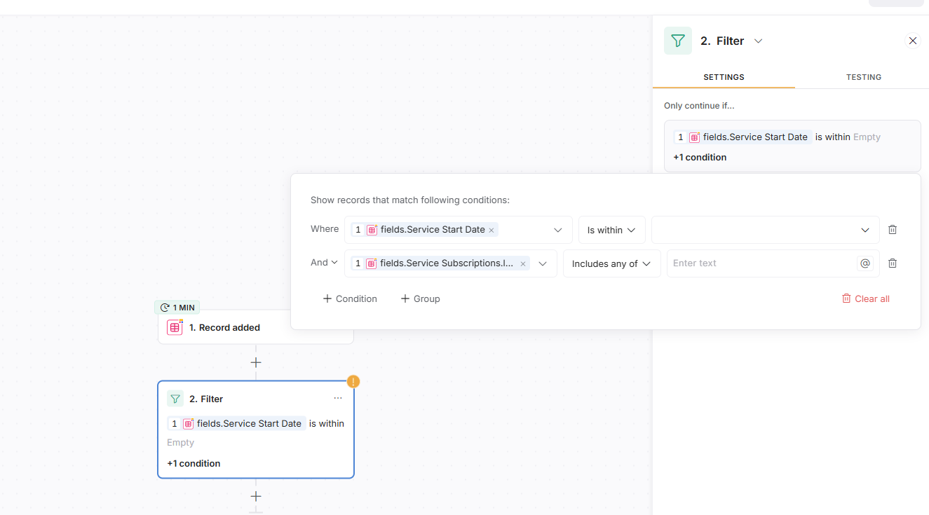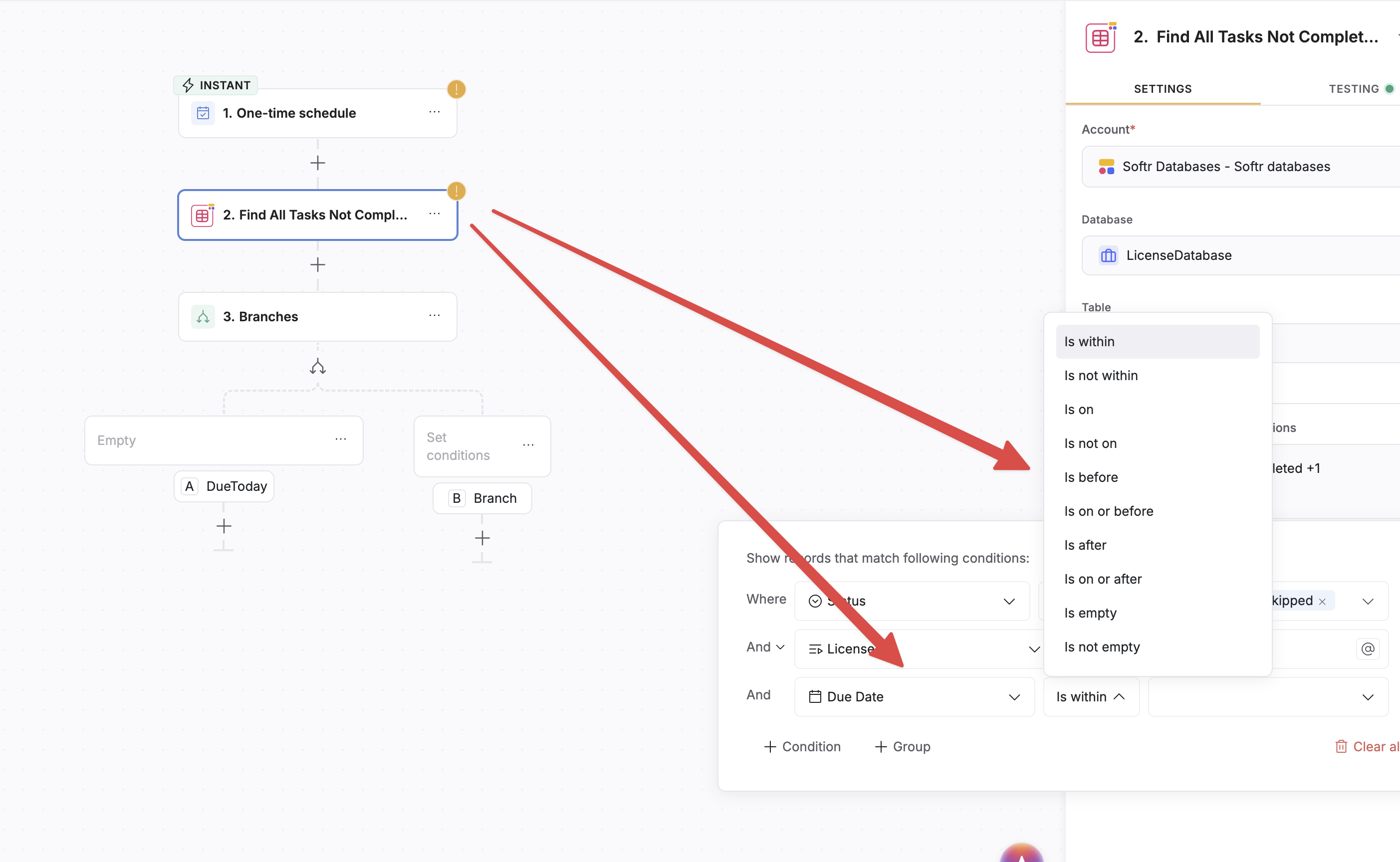 Below is a simple example where even within the same step, the comparison logic is different based on the referenced field. In the screenshot below, Due Date is a date field that holds 1 value, while subscriptions is a linked record that allows linking to multiple records.