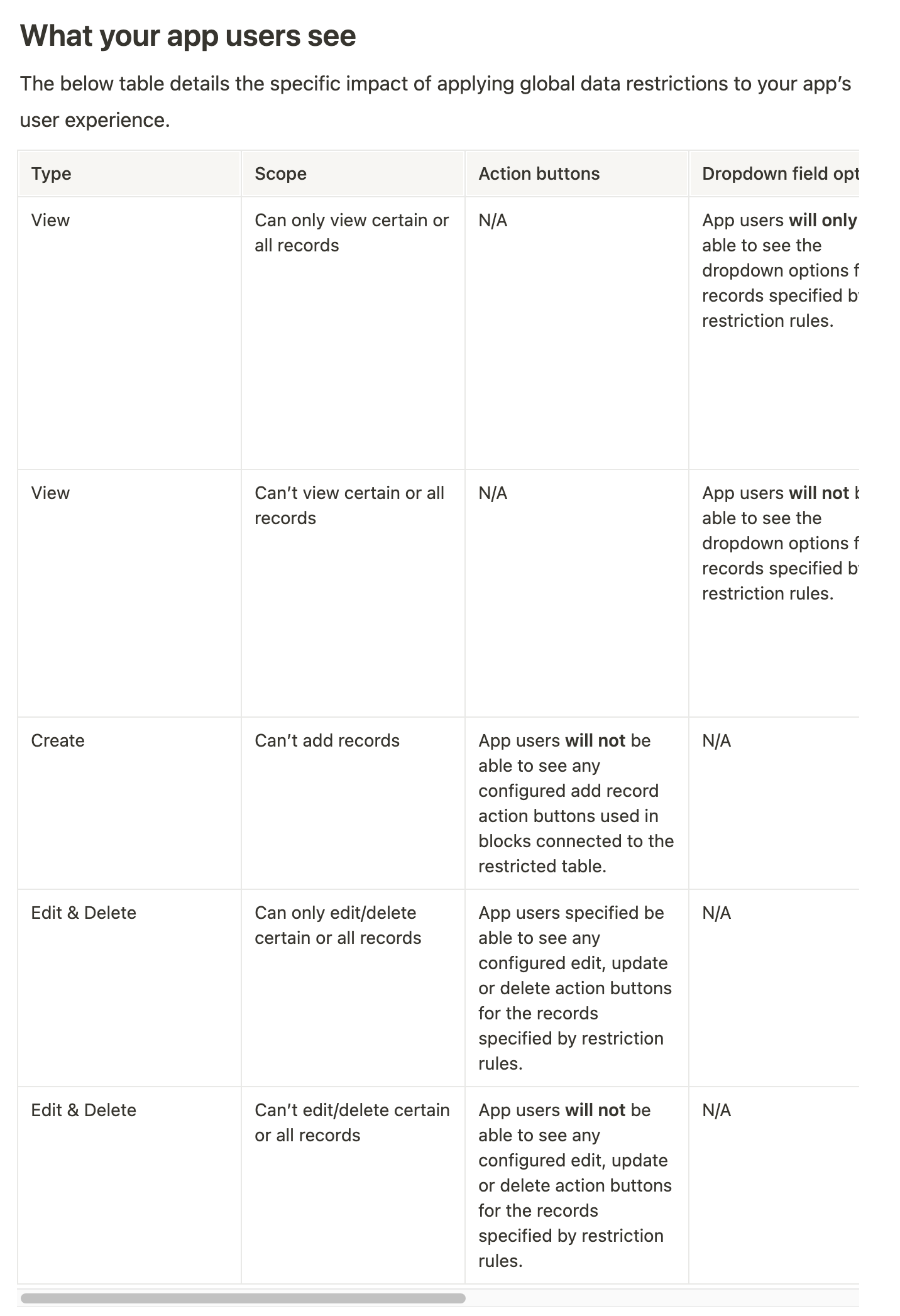 It would be nice if I would be able to turn off buttons by global data restrictions where user is not allowed to edit or create so that they don’t see what they can’t to. Otherwise it would be great to configure the Error Message. Actually for the user it looks like the app is not working correctly. Here’s an example where I try to edit a record, which I’m not allowed to by global data restrictions because I can see the button.