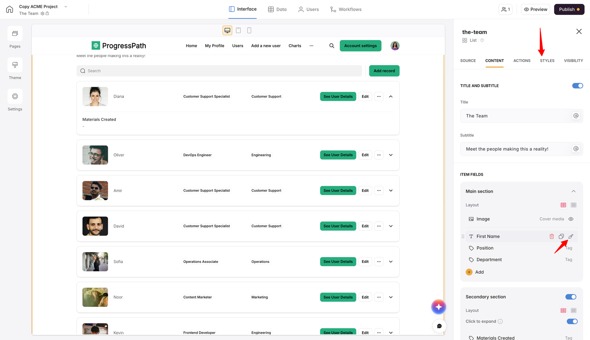 You can either hover on each item field, click on the brush icon and edit the style and size (if applicable for that particular field) separate for that field only, or you can change it checking the general styling for that block in Styles tab. Please check the attached screenshots for the reference: