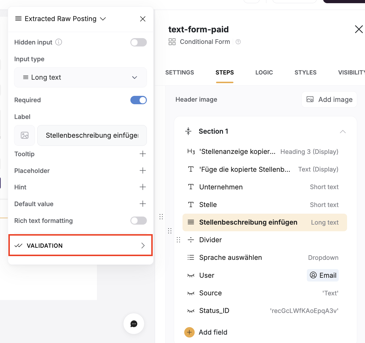 Hello SenRath, I experienced the same issue — I was receiving job postings with a large amount of text. The problem seems to be related to the newly introduced “Validation” option in the field settings.