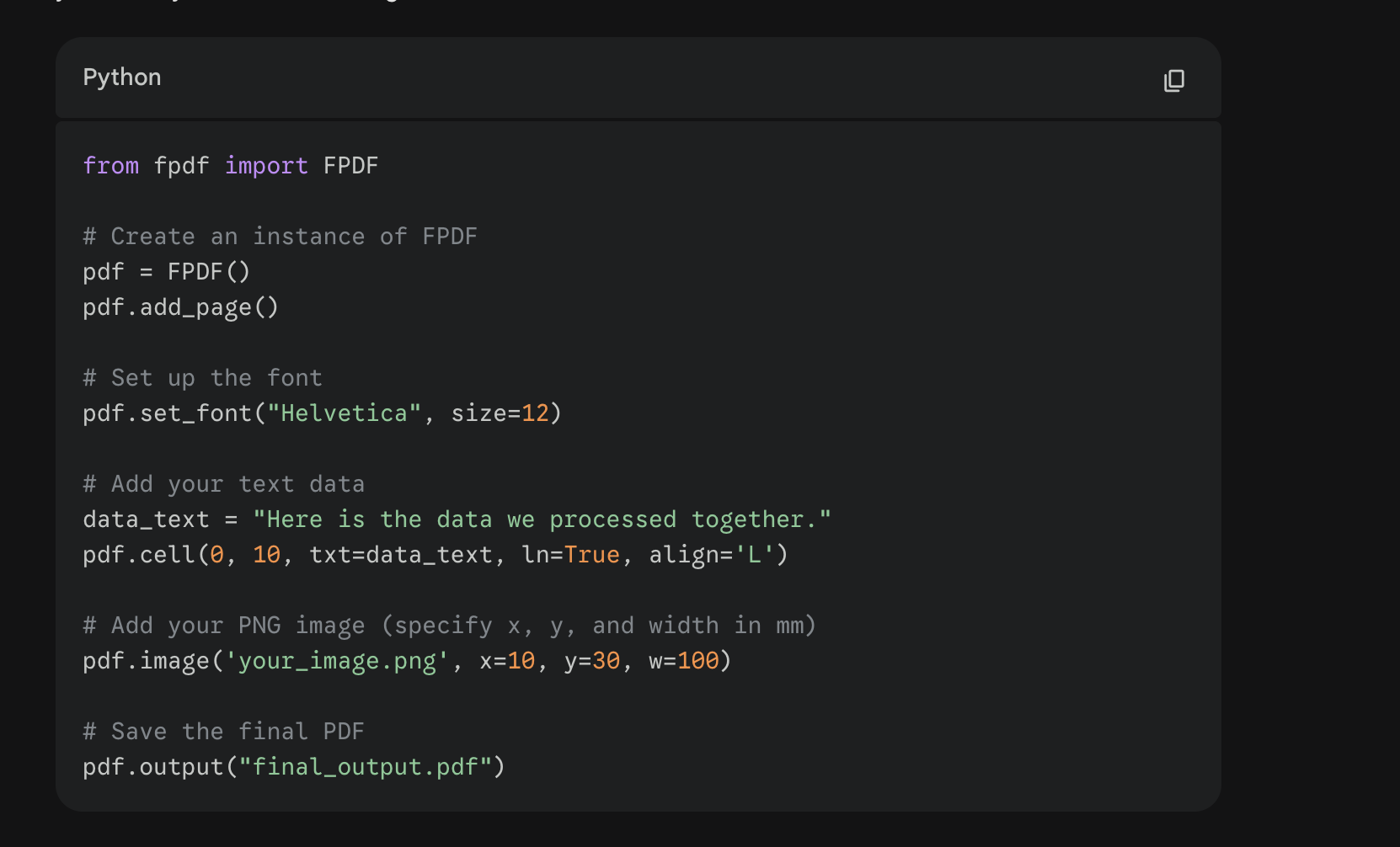 The following has worked in other systems and the API call would be to Gemini to send it a prompt and that data to have it generate the PNG. Then the custom code is just some quick python make it into a PDF. You could then do a nice “PDF Table” that the user can get all their Exports from or return it to the ui as a link that outputs the file.