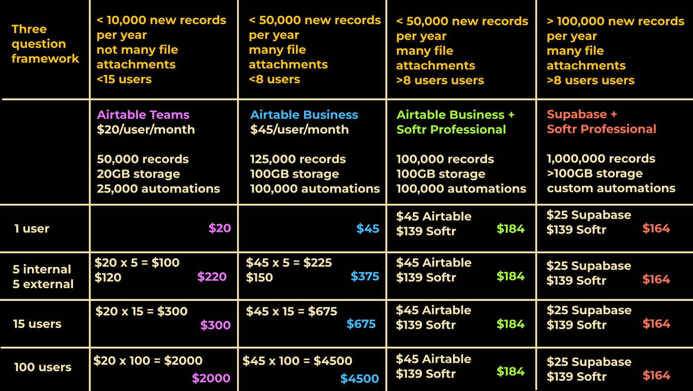 As part of a pricing discovery we made for a client, we ended up comparing the price of using different tech-stacks for building a business automation dashboard. We compared the most reliable tools out there: Airtable, Airtable+softr and Supabase+softr for different use cases and scenarios.
