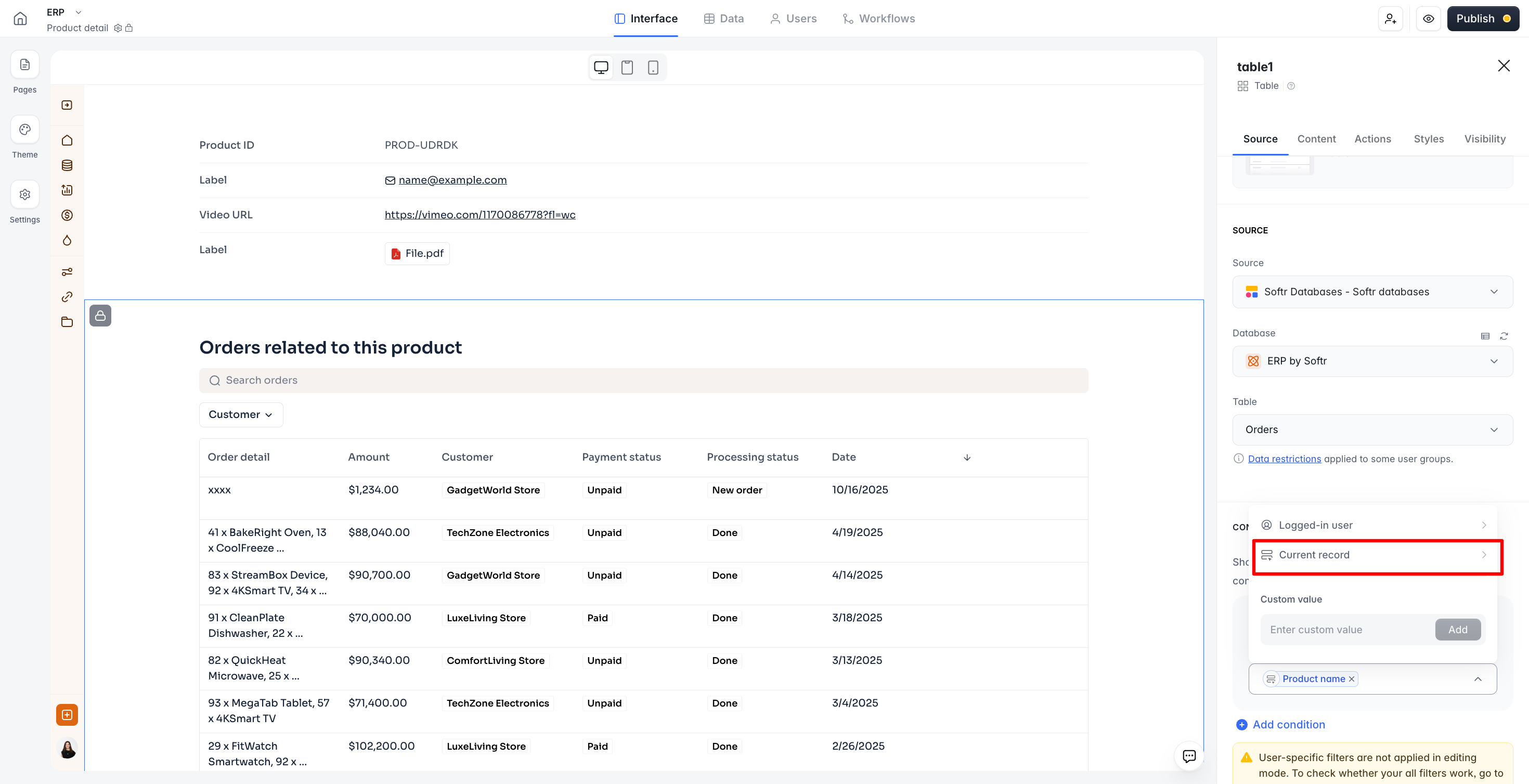 The Current Record is what the first Item Details block on the page displays at any given time. I see that you already have an Item Details block on this page. That means if you add another block, you will be able to apply a conditional filter using the Current Record parameters for that specific block.