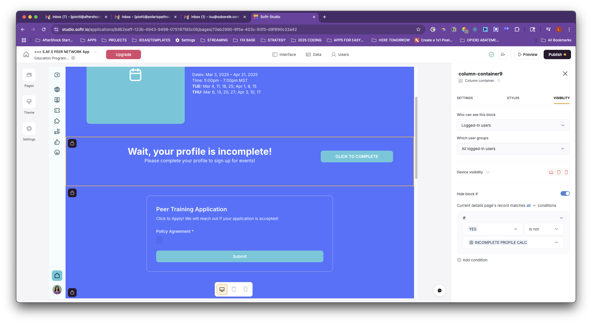 Inside my Education Programs Details page on Softr I have this block with the Device Visibility to she when the Profile is COMPLETE and they can sign up for the Education Program: