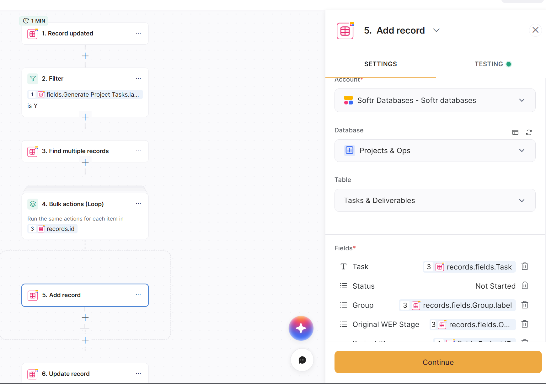 Thanks @Jjenglert , I had a look at that but it didn’t help with my use case. What I’m trying to do is when I start a project, it creates a list of standard tasks from a template table based on the type of project it is. I’ve thought I’d done it right using the bulk action (loop) but it ends up giving each task the same name rather than the ones from the template table.